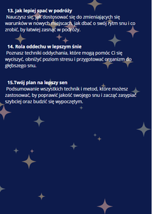 - Odkryjesz skuteczne techniki zasypiania i poprawiania głębokości snu.