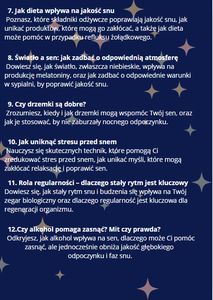 - Przekształcisz swoje codzienne nawyki, by nie tylko spać lepiej, ale i budzić się pełnym energii i gotowym na wyzwania dnia.